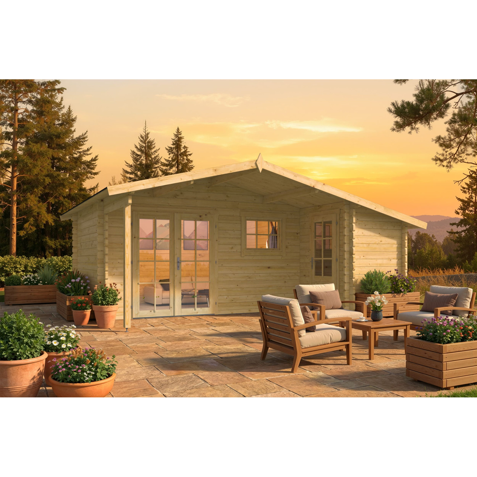 Con unas dimensiones totales de 530x450 cm, esta cabaña de madera es perfecta para múltiples usos: como despacho independiente, pequeña sala de ocio, zona de relax o incluso como casa de invitados en jardines de tamaño medio. Su formato abierto permite una distribución interior totalmente personalizable.