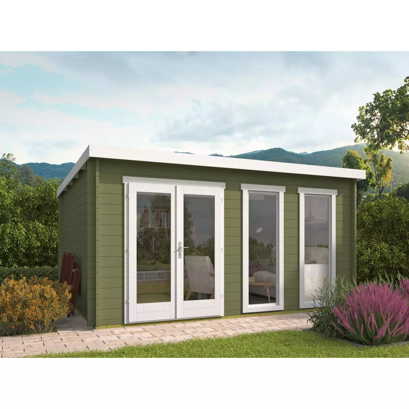 Con una superficie diáfana de 18,2 m² y dimensiones exteriores de 500x400 cm, este modelo permite múltiples usos: desde una pequeña casa de campo hasta una oficina privada o sala de juegos. Su tejado a dos aguas refuerza el diseño tradicional de las casas de madera Elche, con un toque estético que encaja perfectamente en jardines, parcelas o entornos naturales.