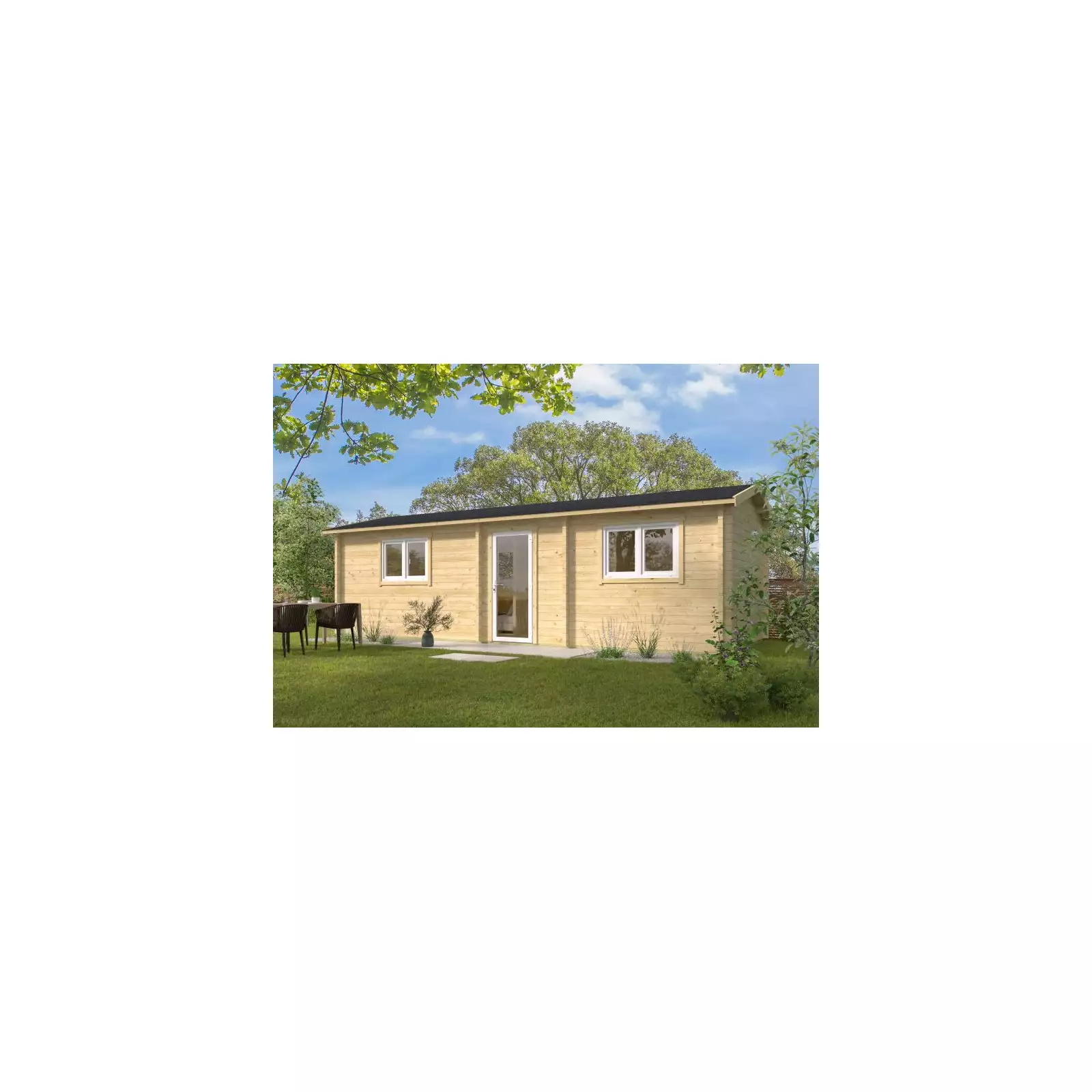 El tejado a dos aguas con caída longitudinal refuerza su carácter rústico y mejora el drenaje del agua de lluvia. Esta construcción también incluye puertas y ventanas con doble acristalamiento 3-10-3 que mejoran tanto el confort térmico como el aislamiento acústico.