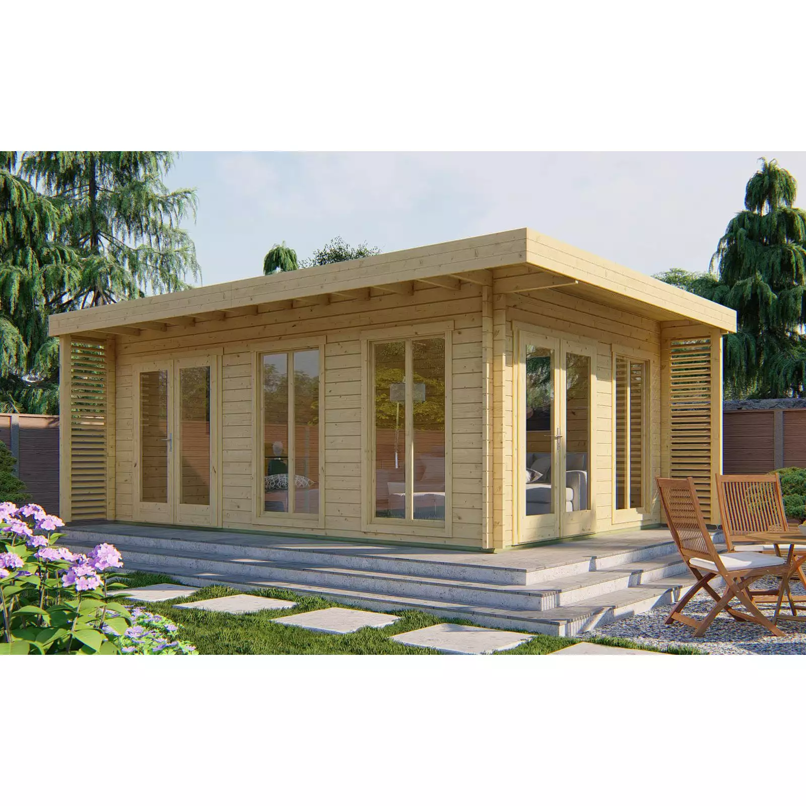 Las Casas de Madera Andalucía combinan diseño contemporáneo y funcionalidad en un modelo diáfano de 22 m². Esta estructura de 590x400 cm está fabricada en abeto nórdico tratado por inmersión y cuenta con lamas de 44 mm, que proporcionan un aislamiento natural óptimo. La cubierta plana le aporta un estilo moderno que encaja perfectamente en entornos rurales y urbanos. Su altura máxima es de 250 cm, lo que aporta una agradable sensación de amplitud interior.