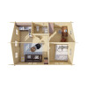 Las Casas de Madera Cádiz son una solución perfecta para quienes buscan una vivienda compacta, robusta y con diseño atemporal. Este modelo ofrece una superficie útil de 34,9 m² distribuidos en un salón con cocina integrada, 2 dormitorios y baño independiente. Todo ello dentro de una estructura optimizada que prioriza el confort interior sin renunciar a la funcionalidad ni al estilo. Fabricadas con madera de abeto nórdico, estas casas de madera Cádiz están construidas exclusivamente con lamas procedentes del centro del tronco, lo que garantiza mayor resistencia y capacidad aislante. Su sistema de montaje por machihembrado entrecruzado potencia la estabilidad estructural y refuerza el aislamiento natural, aportando un interior acogedor y protegido tanto del frío como del calor. El diseño clásico con tejado a dos aguas encaja perfectamente tanto en paisajes rurales como en urbanizaciones, aportando elegancia, calidez y un estilo mediterráneo muy acorde con la estética de las casas prefabricadas Cádiz. La abundante entrada de luz natural, gracias a sus 6 ventanas con doble acristalamiento, permite disfrutar de un ambiente luminoso y energéticamente eficiente en todas sus estancias.