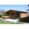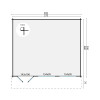 La Casa de Madera Laredo modelo Truus-Tova ofrece 27,6 m² de espacio diáfano con un alero frontal de 75 cm, construida en abeto nórdico de 44 mm con sistema entrecruzado. Su tejado a dos aguas y los grandes ventanales de 154x95 cm con doble acristalamiento 4-6-4 mm proporcionan una luminosidad excepcional y un aislamiento térmico superior.