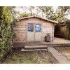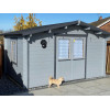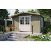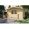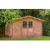 La Casa de Madera Moncófar modelo Dyre ofrece 10,2 m² de espacio diáfano con lamas machihembradas de 40 mm en abeto nórdico y un práctico diseño de 400x300 cm. Su sistema entrecruzado de ensamblaje proporciona una estructura estable y resistente, con la posibilidad de colgar estanterías en las paredes sin comprometer la solidez del conjunto.