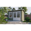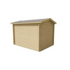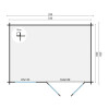 Fabricada en abeto nórdico tratado por inmersión, cuenta con lamas machihembradas de 40 mm de grosor que garantizan un excelente aislamiento térmico y acústico. Sus medidas exteriores de 350x250 cm y una altura máxima de 243 cm permiten un aprovechamiento óptimo del espacio. El tejado a dos aguas con tarima de 18 mm asegura un drenaje eficaz, mientras que la puerta doble de 162x189 cm con cristales fijos y cerradura de seguridad completan un equipamiento muy funcional.