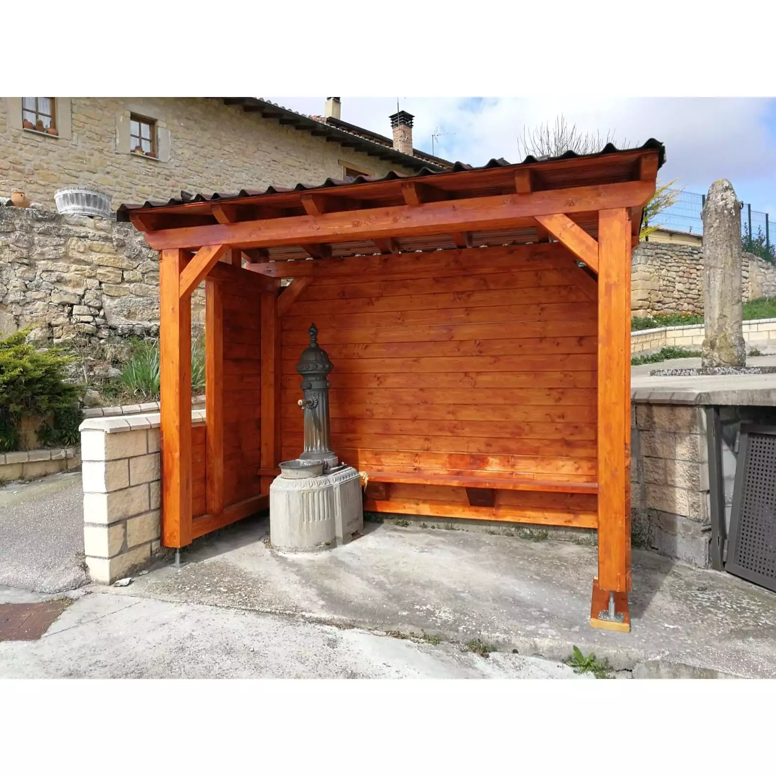 Marquesina autobus fabricada en abeto laminado de 28MM de grosor. Con una superficie de 6 m2 está pensada para colocar como mobiliario urbano, es muy cómoda como parada de autobus, lleva un banco de madera en el interior.