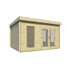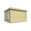 La Casa de Madera Peñíscola modelo Bruce es una construcción contemporánea de 12 m² con paredes de abeto nórdico de 40 mm, tejado plano con ligera inclinación trasera y una luminosidad excepcional gracias a su doble puerta frontal acristalada y tres ventanales panorámicos con doble acristalamiento en vidrio templado. Su diseño diáfano permite múltiples usos, desde oficina independiente hasta estudio creativo o sala de ocio.