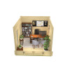 Esta casita de madera rectangular de madera dispone una puerta doble de abertura exterior y dos ventanales en la parte lateral los cuales se pueden colocar en par en cualquiera de las dos paredes, según prefiera el cliente. Además, son de doble acristalamiento de vidrio templado y la puerta tiene una medida de paso de 160x185 cms. La puerta va provista de una cerradura multipunto.