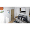 Acceso al interior por puerta doble provista de ventanas fijas alargadas de doble acristalamiento que, junto con otras 2 ventanas también provistas de doble acristalamiento, proveen al interior de las casas de una magnifica luz natural. Además, tiene una pequeña ventana para el baño de 51x51cm.