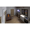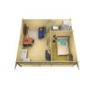 Casas de madera prefabricadas Cantabria. Originales casas de madera con estancias, con habitación, baño y salón, tiene una superficie de 28 m2 y un alero frontal de 70 cms. Tiene una distribución de salón cocina, habitación y baño muy útil como casa de campo o de invitados.