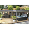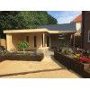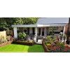 Su distribución permite aprovechar las esquinas del jardín o la parcela de forma inteligente, creando zonas diferenciadas de interior y exterior sin perder amplitud. Incluye puerta doble con cristales fijos, cuatro ventanas batientes con doble acristalamiento 3-6-3 mm y tejado plano con tarimas sólidas, todo ello pensado para maximizar la luminosidad y el confort.