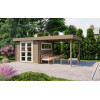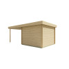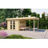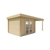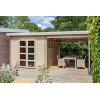 La casa de madera prefabricada modelo Dellinger combina un espacio cerrado de 7,8 m² con una pérgola lateral cubierta de 7,8 m² en un diseño moderno de tejado plano y líneas rectas. Fabricada con lamas de abeto nórdico de 28 mm, esta estructura de 598x298 cm ofrece dos zonas diferenciadas en un solo conjunto, perfecta para quienes buscan funcionalidad y estética contemporánea.
