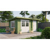 La casa de madera prefabricada Rhon de 450×300 cm ofrece dos estancias diferenciadas de 7,8 m² y 4 m², ideales para crear un estudio de jardín, un taller o una habitación de invitados independiente. Fabricada con paneles de abeto nórdico de 34 mm de grosor, combina un excelente aislamiento térmico con la calidez y belleza natural de la madera.