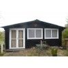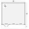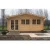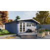 Con dimensiones exteriores de 600x600 cm más alero, este modelo incluye puerta doble acristalada de 143x196 cm con cerradura, ventanas con doble acristalamiento de 154x95 cm y kit completo de tornillería. El sistema entrecruzado de las lamas machihembradas asegura resistencia estructural y un aislamiento térmico y acústico óptimo para uso continuado.