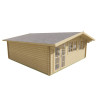 La Casa de Madera Prefabricada Tenerife modelo Helle ofrece 33,6 m² de espacio diáfano con lamas de 44 mm en abeto nórdico tratado contra xilófagos. Su diseño con tejado a dos aguas y alero frontal de 75 cm crea un interior extraordinariamente amplio y luminoso, con una altura máxima de 290 cm que proporciona una sensación de confort habitacional superior.