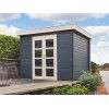 La puerta doble de 144x203 cm con cristales fijos de 4 mm y la ventana lateral de 55x188 cm proporcionan una excelente entrada de luz natural al interior, mientras que el sistema de lamas machihembradas entrecruzadas garantiza estabilidad estructural y un montaje sencillo con las piezas preensambladas. La altura de 225 cm permite un uso cómodo como espacio de trabajo o almacenaje.