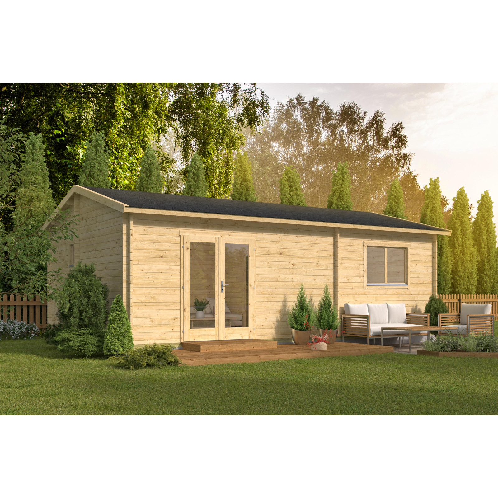 Fabricada en resistente abeto nórdico tratado contra xilófagos, esta casa incluye dos dormitorios de 8 m² y 6 m², un baño de 4 m² y un amplio salón-cocina de 18 m². Todo ello se distribuye en una estructura robusta construida con lamas machihembradas de 44 mm, ofreciendo aislamiento natural y durabilidad.