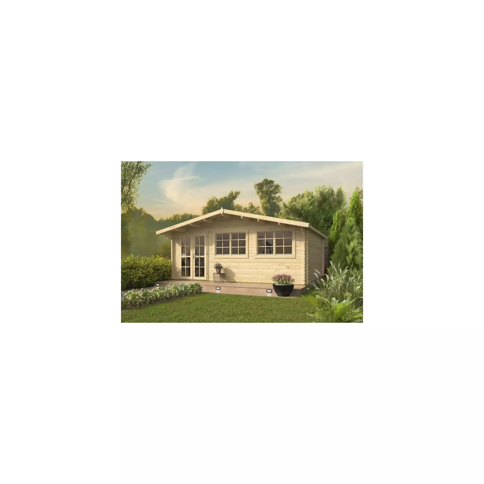 La estructura está compuesta por lamas de madera machihembradas de 44 mm de grosor, unidas por el sistema entrecruzado que refuerza la solidez de la casa y permite colgar estanterías sin debilitar las paredes. Las medidas interiores son 575x480 cm, mientras que las exteriores alcanzan los 595x500+75 cm con alero.