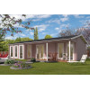 Casas prefabricadas de madera Barbate ideales para invitados. Hecho de madera de 70 mm y mide en total 1120x595 cms, es un modelo alargado con tejado a dos aguas. En el interior tiene cuatro habitaciones, junto con un pasillo.