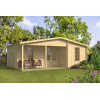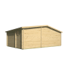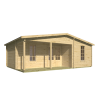 El grosor de 70 mm de la madera de abeto nórdico proporciona un excelente aislamiento térmico, complementado por ventanas con doble acristalamiento y un suelo machihembrado de 19 mm sobre rastreles. El porche frontal de 6,2 m² amplía el espacio habitable hacia el exterior, creando una zona cubierta perfecta para disfrutar del jardín en cualquier época del año.