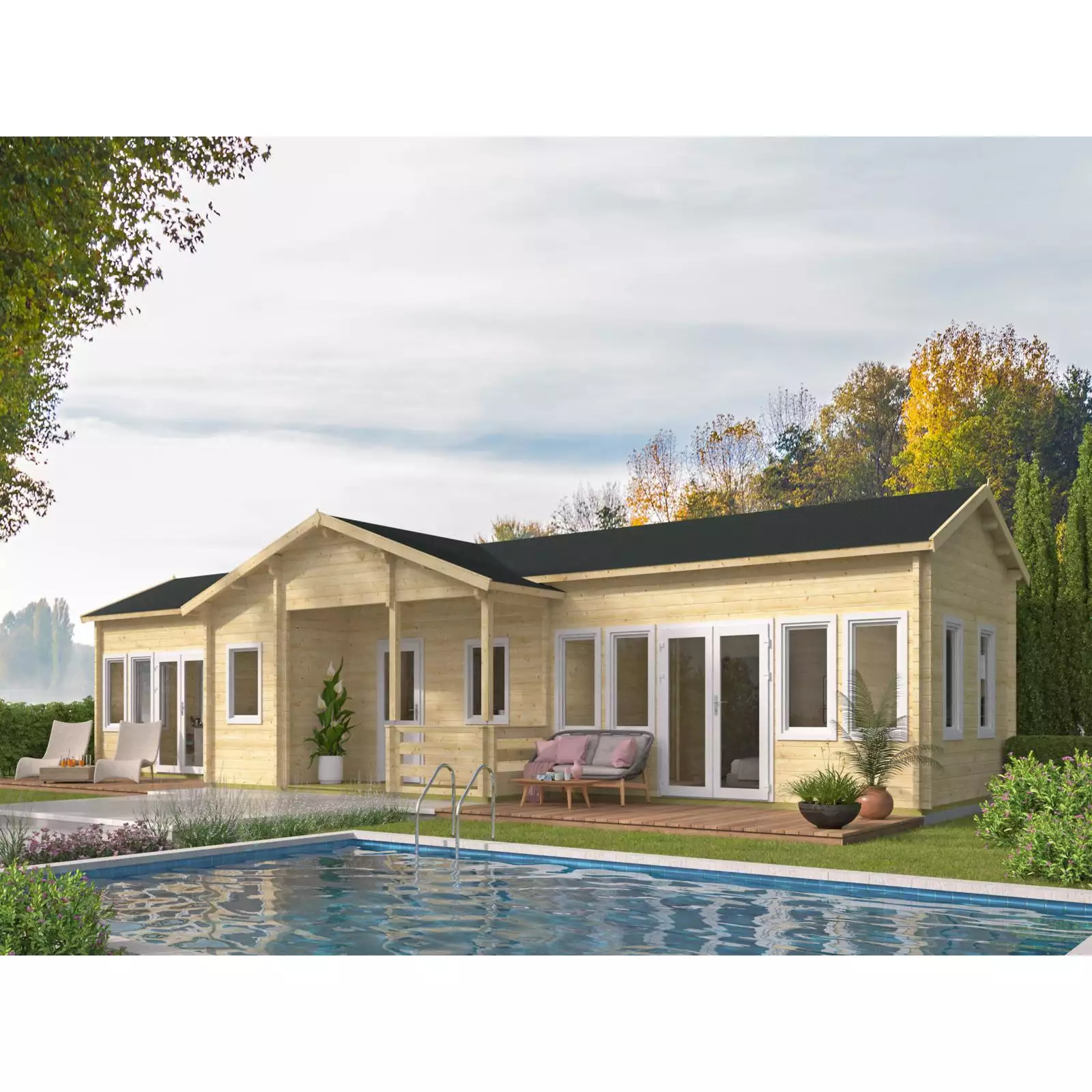 Esta casa de madera está fabricada con lamas machihembradas de 70 mm de grosor, lo que hace sea una casa muy robusta y le dota de un aislamiento natural como es la madera además de un ambiente muy acogedor. Las lamas van unidas entre sí mediante el sistema entrecruzado para conseguir una gran resistencia estructural.