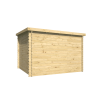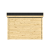 La cubierta se ejecuta en tarima machihembrada, un soporte homogéneo y resistente frente a humedad y cambios térmicos, muy superior a tableros ligeros. El tejado a un agua simplifica el drenaje hacia la parte trasera; la tela asfáltica incluida sella desde el primer día, y podrás actualizar el acabado (tegola, EPDM) si tu clima lo aconseja. En días de viento, el sistema anti-tormentas refuerza el conjunto para mantener la geometría.