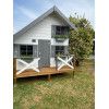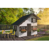 La caseta de jardín infantil modelo Lola es una de las opciones más completas y encantadoras para crear un espacio de juego al aire libre. Fabricada en resistente abeto nórdico natural y diseñada con paneles de 16 mm de grosor, esta casita ofrece una estructura sólida, segura y fácil de montar. Su estética tradicional con tejado a dos aguas y detalles como jardineras o contraventanas la convierten en una pieza única para cualquier jardín. Una de las características más destacadas de esta caseta de jardín infantil es su diseño en dos alturas. En su interior, los niños podrán subir mediante una escalera de madera (incluida) a un altillo de 60 cm de ancho, ideal para colocar una camita o zona de descanso. Este elemento no solo multiplica el espacio de juego, sino que fomenta la imaginación y el juego simbólico. Las medidas totales de la caseta de jardín infantil son de 220x180 cm. La estructura alcanza una altura máxima de 230 cm en el centro del tejado, con una altura de pared principal de 167 cm y una más baja de 112 cm. Incluye cuatro ventanas con contraventanas, paneles de policarbonato y una puerta exterior de apertura frontal. La cubierta se compone de tarima machihembrada de 15 mm, ofreciendo alta durabilidad y estabilidad estructural.