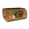 Gracias a su diseño curvo y su distribución diáfana, la caseta de jardín para oficina ofrece un entorno de trabajo tranquilo, confortable y muy versátil. Su forma oval optimiza el espacio interior, mientras que los acabados en madera natural crean una atmósfera acogedora y profesional. Es una elección ideal para quienes valoran el equilibrio entre estética, funcionalidad y confort.