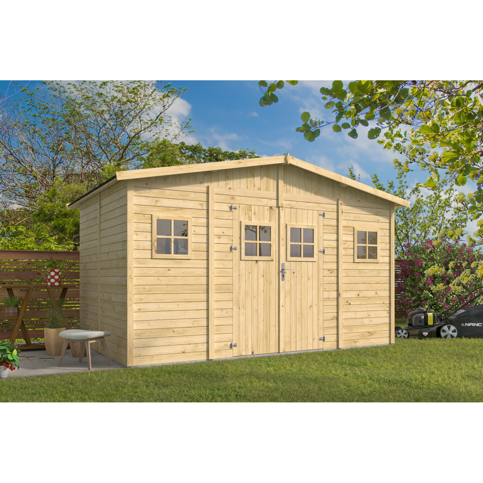 La envolvente en panel de madera machihembrada de 16 mm aporta estabilidad y un ensamblaje ágil incluso si no tienes experiencia. La puerta doble de 155×188 cm, con cristal de 4 mm y cerradura, despeja el paso para mover mobiliario o cajas; las dos ventanas fijas de 55×63 cm suman luz natural y visibilidad del interior. El tejado a dos aguas facilita el drenaje y cuida el contenido frente a la lluvia.