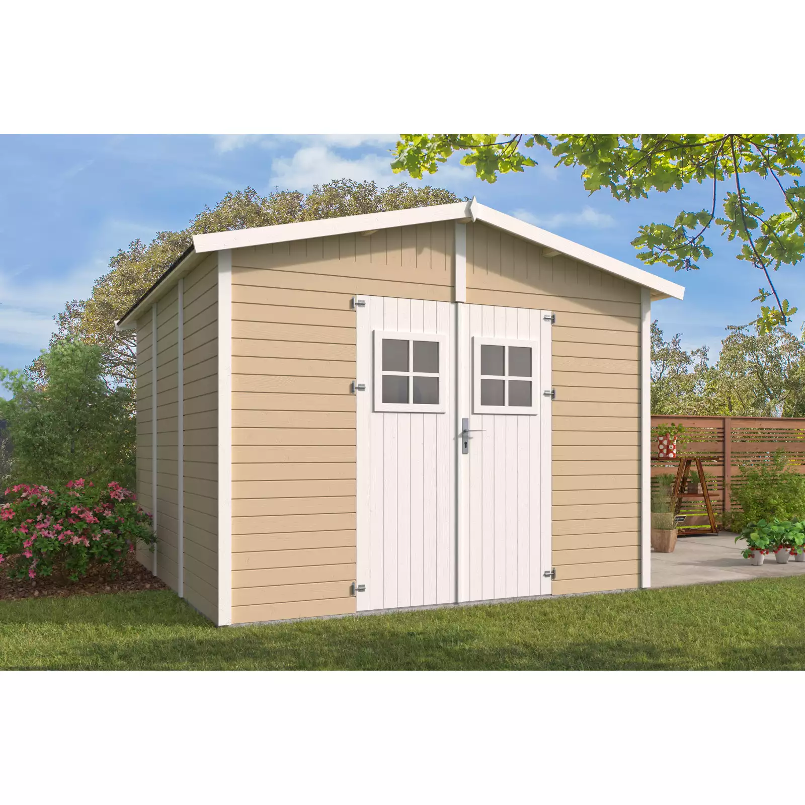 Cuando el jardín se llena, una caseta bien resuelta cambia la rutina. La Mijas apuesta por un sistema de paneles preensamblados de 16 mm que acelera la instalación y deja la estructura lista para el uso semanal. En su planta 300×300 cm, los 9 m² se aprovechan de verdad: estantes perimetrales para clasificar, un tramo libre para maniobrar con cajas o bicicletas, y luz natural suficiente para trabajar sin encender nada en pleno día.