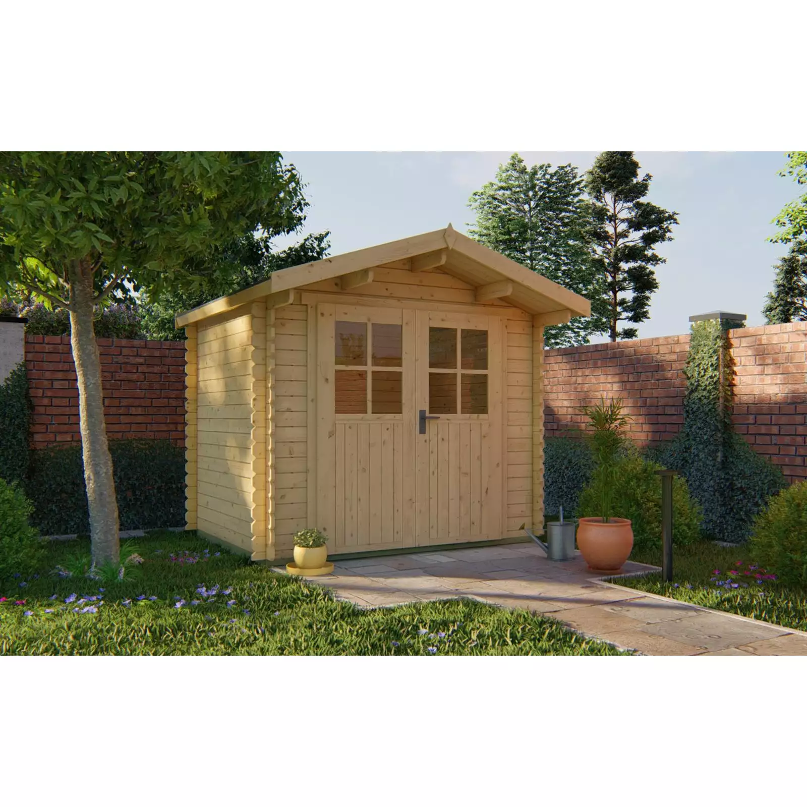 Fabricada con abeto nórdico tratado por inmersión contra xilófagos, esta cabaña asegura una larga vida útil y excelente comportamiento ante la humedad y el paso del tiempo. Las lamas de madera de 28 mm de grosor garantizan aislamiento natural y estabilidad estructural. Su ensamblaje mediante sistema entrecruzado aporta gran robustez, ideal incluso para colgar estanterías o herramientas de peso.