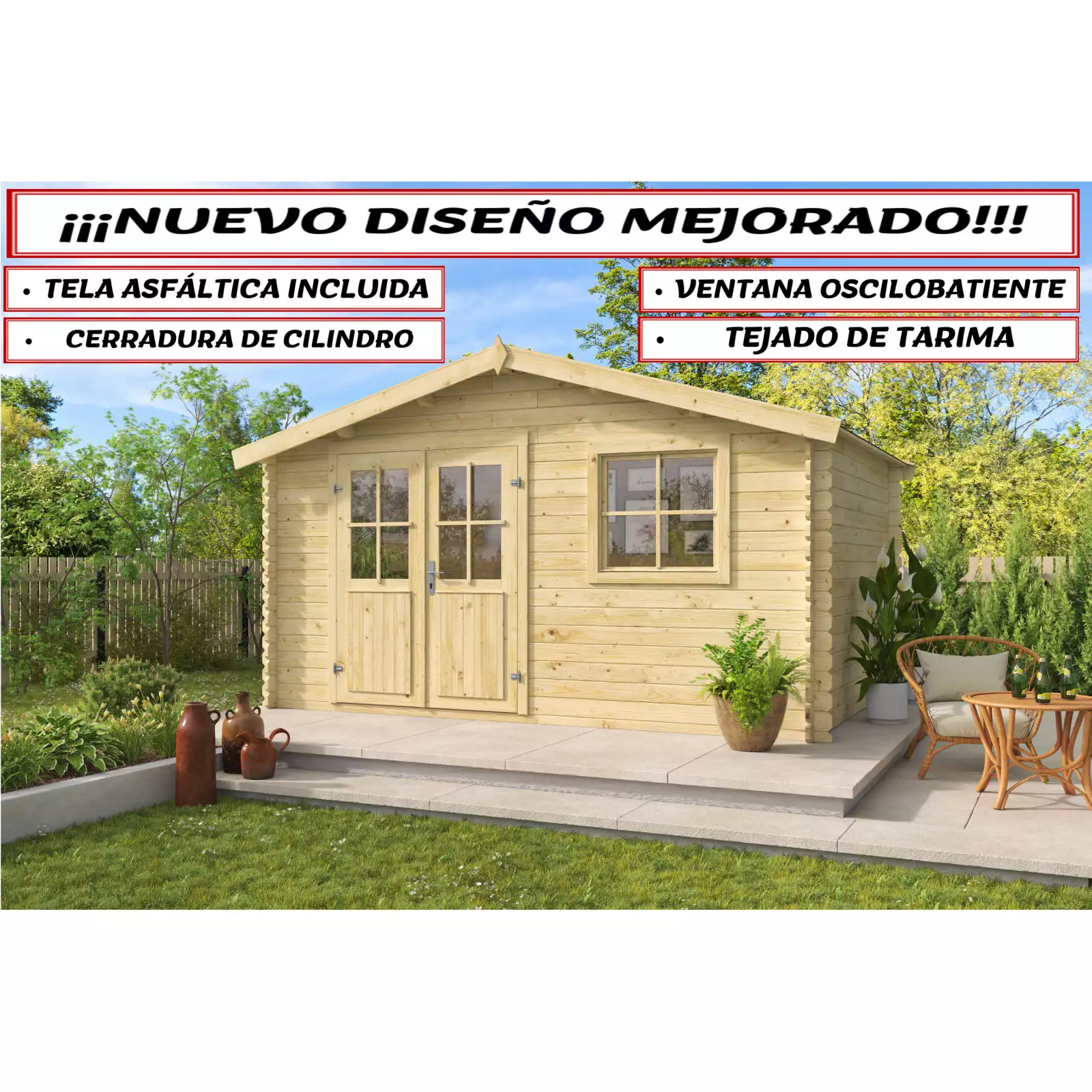 Dispone de una ventana frontal de 82x82 cm con apertura oscilo-batiente y la caseta tiene una altura máxima de 234 cm y la altura lateral de 183 cm. Además, incluido en el precio de las Casetas de Madera Gorliz, dispone de tela asfáltica para impermeabilizar el tejado, listones anti-tormentas en las esquinas e incluye el transporte con descarga.