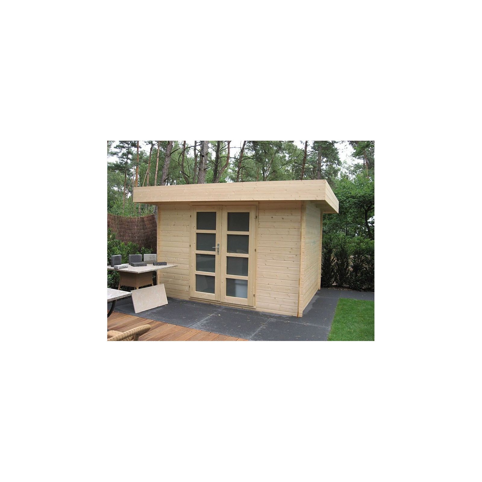 Casas de madera Vendrell con techo plano. Esta casita de madera tiene una superficie de 7,7 m2. Es un diseño muy moderno para poner en el jardín. Además al tener puerta doble es muy cómoda para meter herramientas, corta césped...