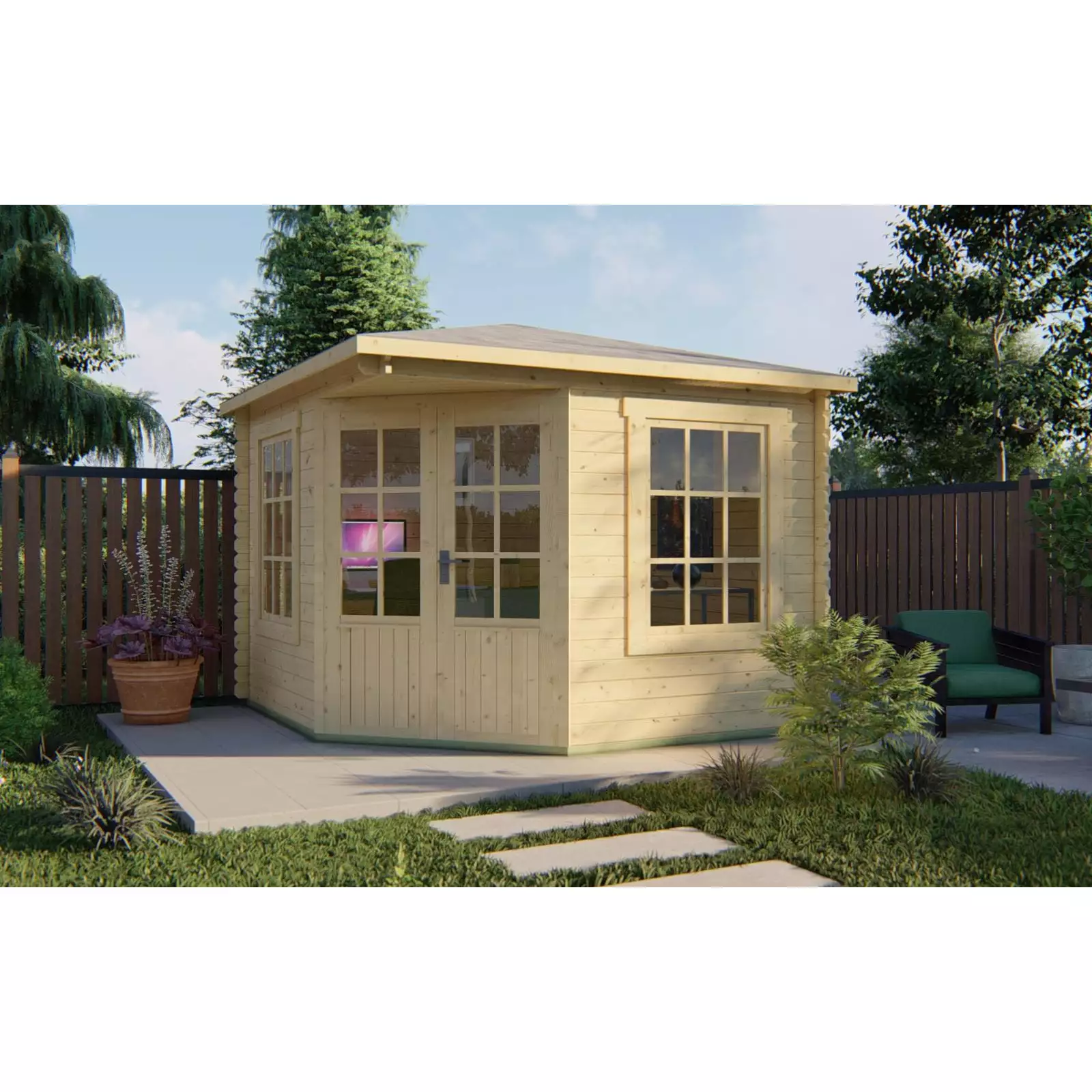 Con unas dimensiones exteriores de 300x300 cm, una altura máxima de 250 cm y una altura mínima de 211 cm, esta caseta destaca por su diseño con estructura de tejado a cuatro aguas y su perfecta adaptación a ubicaciones en ángulo, siendo una excelente opción dentro de las casas esquina más demandadas del mercado.