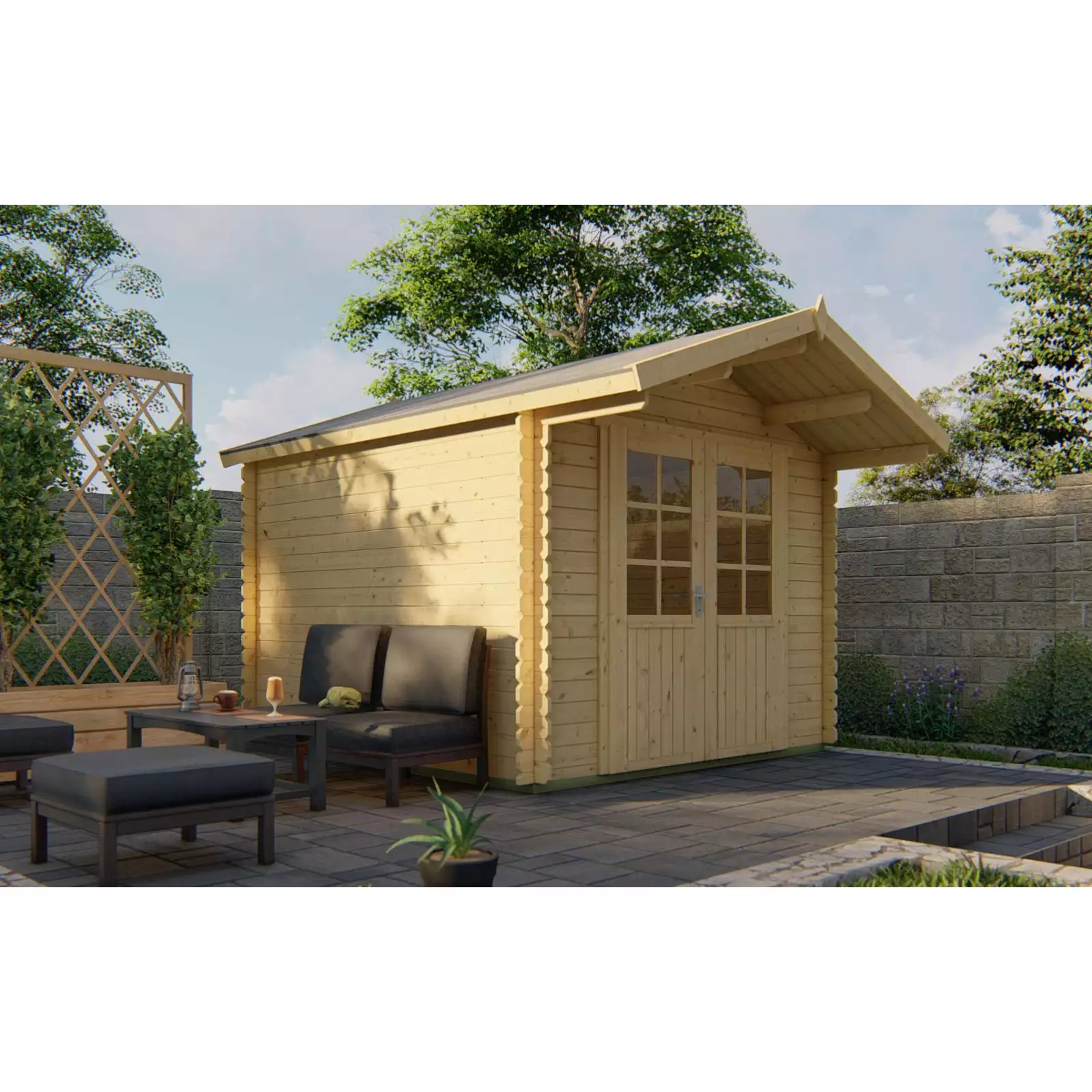Gracias a sus lamas machihembradas de 28 mm, las casas prefabricadas Getafe cuentan con una estructura sólida que asegura un uso prolongado. El sistema entrecruzado de ensamblaje proporciona estabilidad adicional y permite incluso colgar estanterías en las paredes sin riesgo de deformación. Su altura máxima de 247 cm y mínima de 195 cm garantizan un espacio cómodo, con buena ventilación y amplitud interior.