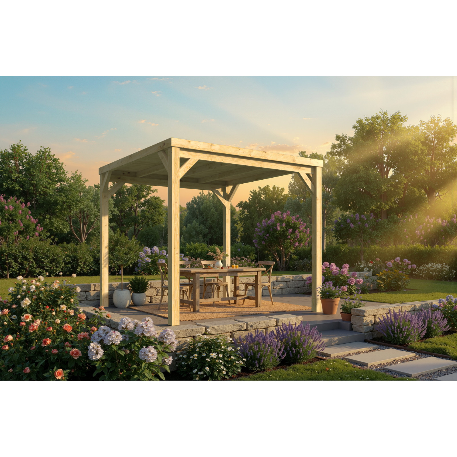 El cenador de madera JIJONA-D es una estructura autoportante con techo de 290x290 cm (aproximadamente 3x3 metros) que te permite crear un espacio cubierto y protegido en cualquier zona de tu jardín o terraza. Gracias a su diseño independiente con 4 postes, no necesita apoyarse en ninguna pared ni estructura existente: se coloca directamente sobre una superficie firme y queda perfectamente estable por si solo. Este cenador cubierto de jardín es la solución perfecta para quienes buscan un espacio exterior protegido de la lluvia y el sol directo, donde poder comer, descansar o reunirse al aire libre durante todo el ano.