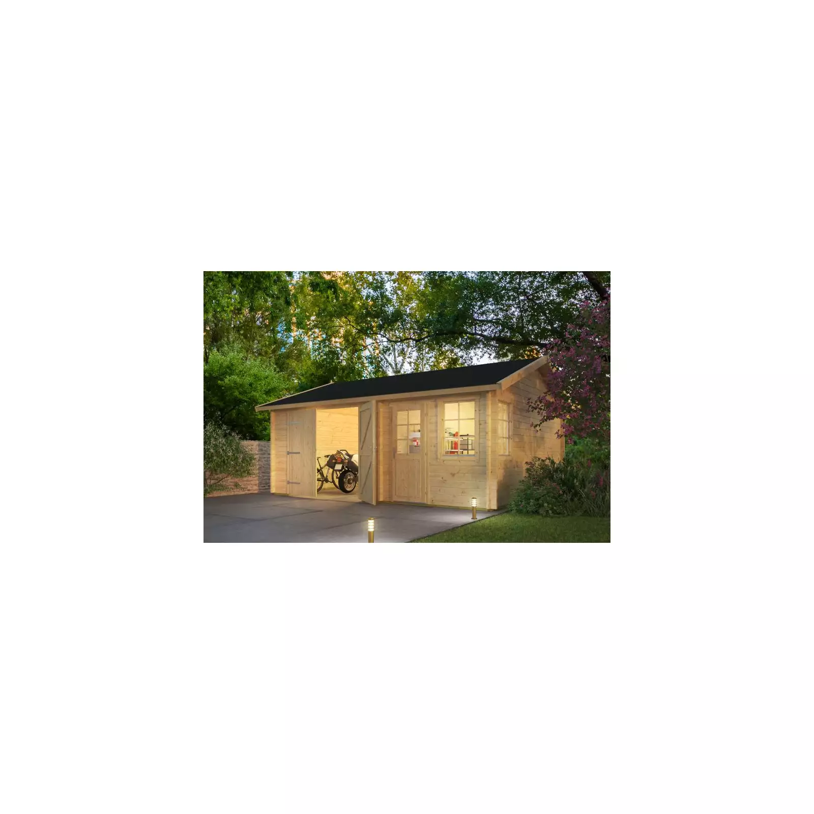 La madera en la que ha sido construido es de abeto nórdico natural. La altura máxima es de 310 cms y la mínima 222 cms. Tiene el tejado a 2 aguas. Está fabricado con lamas de madera machihembradas de 44 mm de grosor, lo que hace que sea una estructura muy robusta y bien aislada.