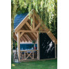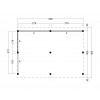 Modelo Billund tipo 2 - paredes negras (ZW) Medidas exteriores 600 x 460 cm Planta 600 x 400 cm Altura de cumbrera 420 cm Paso libre frontal 279 cm Material Pino rojo laminado Postes 14x14 cm Tipo de techo Asimétrico a dos aguas Paredes Trasera y balaustrada lateral en tarima negra