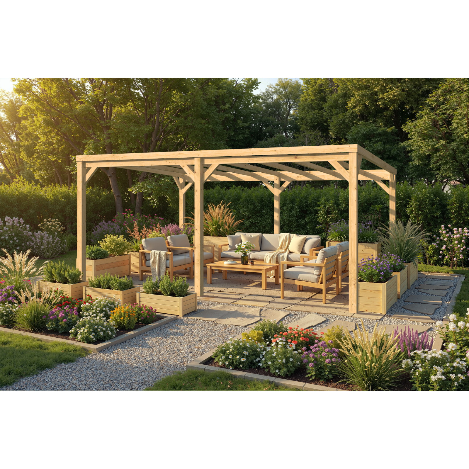 Con 4 metros de ancho y casi 6 metros de largo, esta pérgola autoportante de madera ofrece una superficie útil de más de 22 metros cuadrados. Es una de las pérgolas descubiertas más grandes del catálogo, pensada para usos que requieren espacio generoso: aparcamiento de vehículos de gran tamaño, zona de reunion al aire libre o soporte para jardineria vertical.