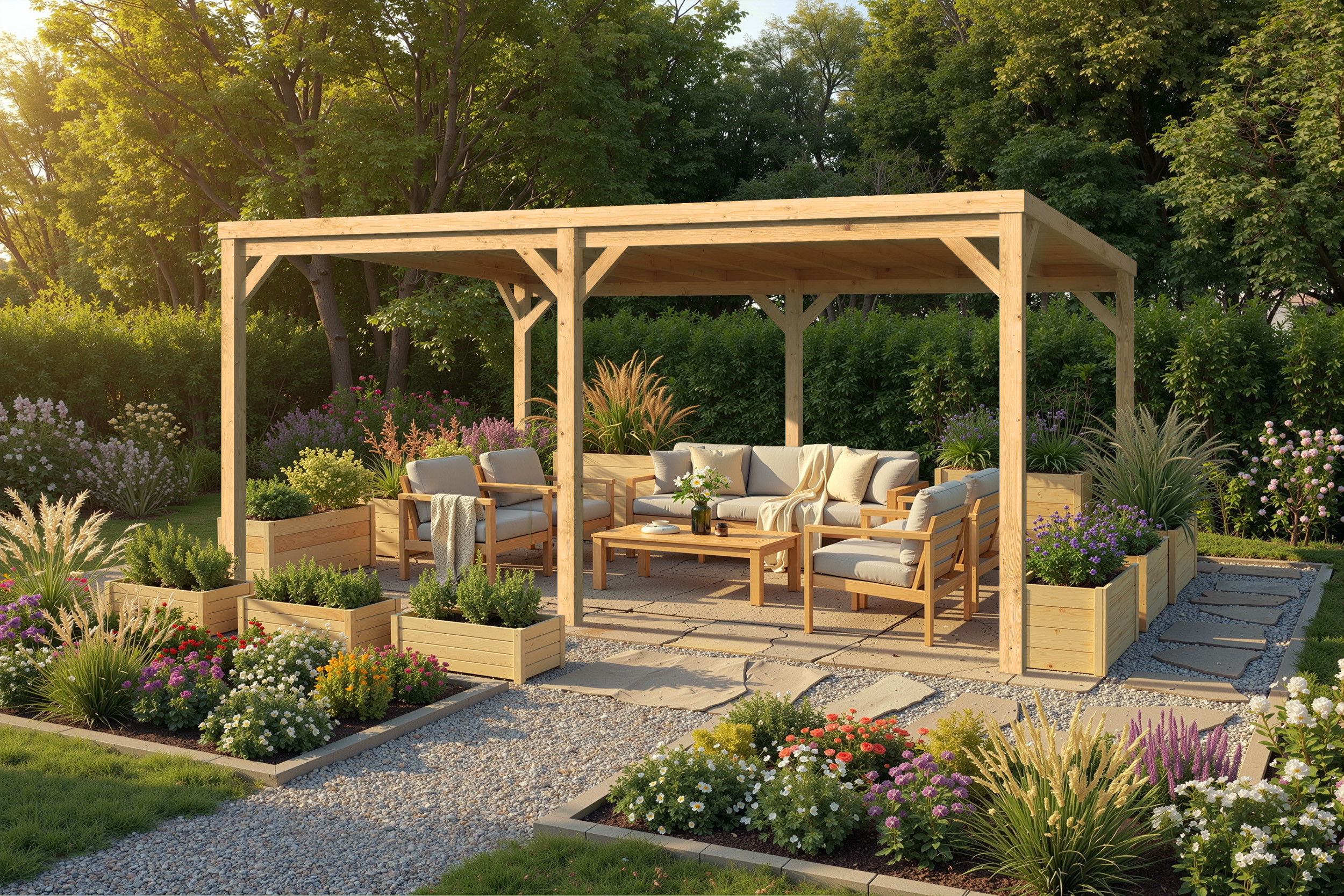 Una pérgola autoportante de madera de gran formato perfecta para jardines amplios, zonas de aparcamiento o cualquier proyecto de paisajismo exterior.