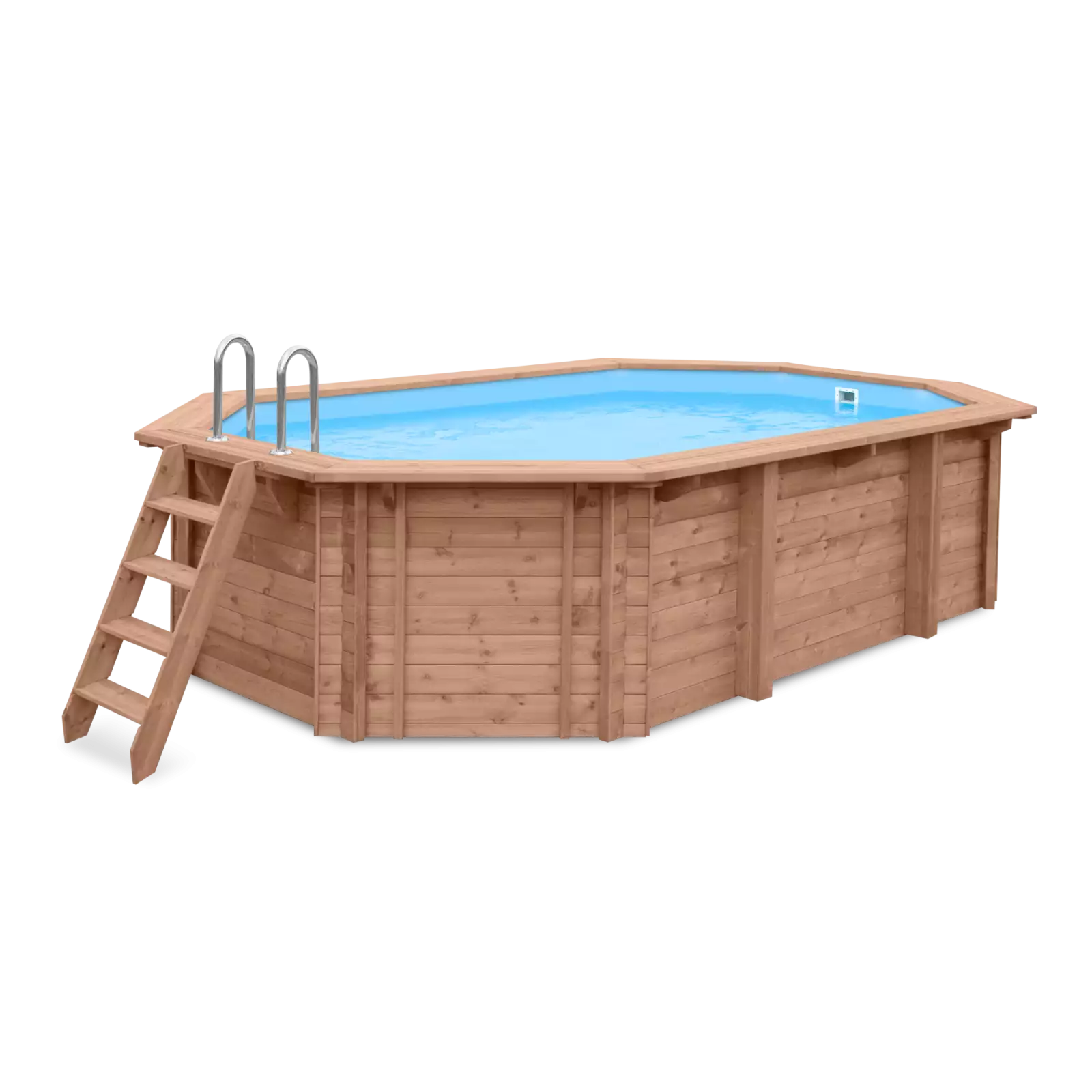 Piscina desmontable de madera de forma octogonal, de ancho 563 cms, de largo 352 cms y altura 124 cms.