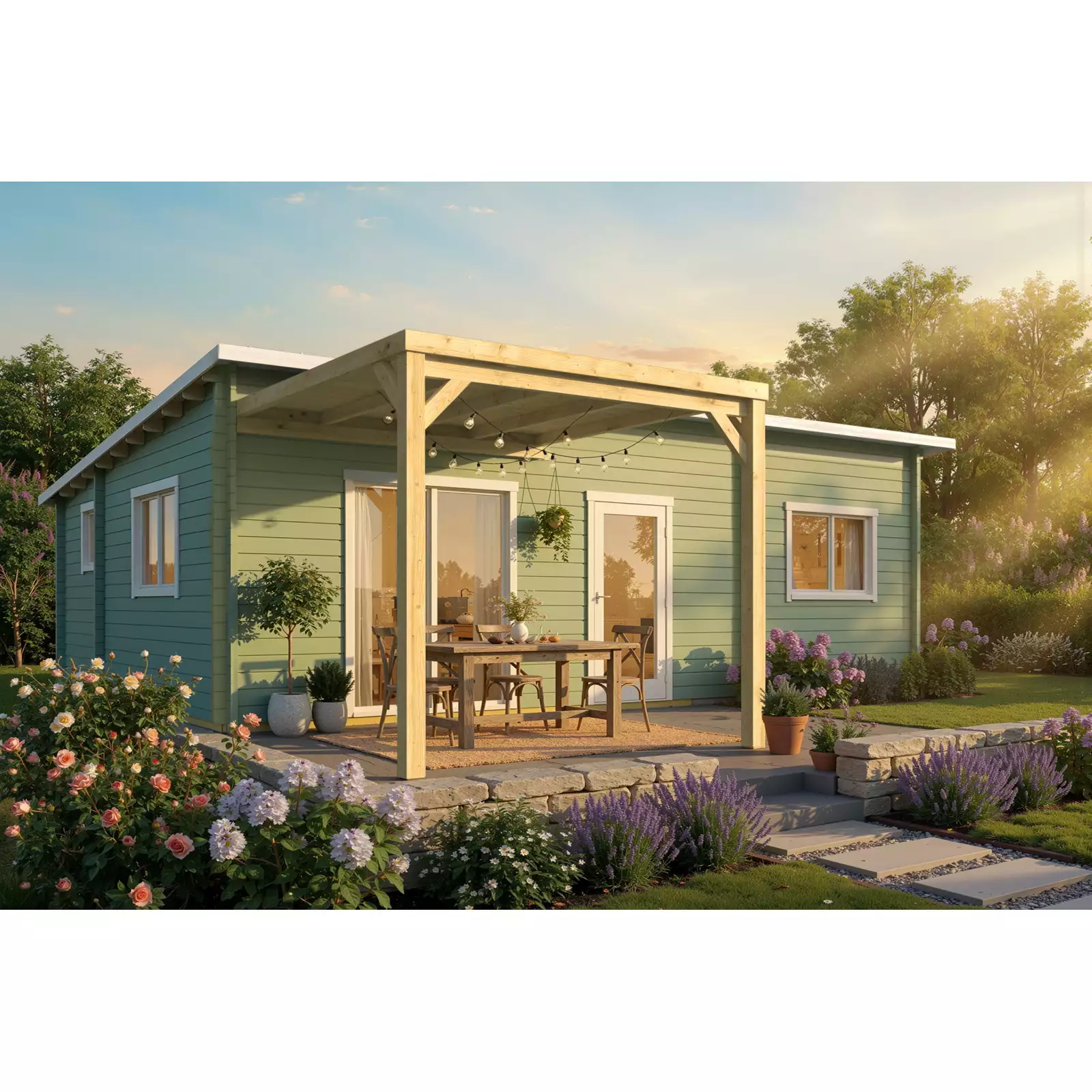 El porche de madera cubierto JIJONA-B ha sido diseñado pensando en la funcionalidad y la durabilidad. Su configuración de porche adosado a pared permite aprovechar la estructura de la vivienda como punto de anclaje, lo que simplifica el montaje y aumenta la estabilidad del conjunto. El tejado a un agua evacua el agua de lluvia de forma natural hacia el exterior, evitando acumulaciones y protegiendo tanto la pared como el suelo bajo el porche.