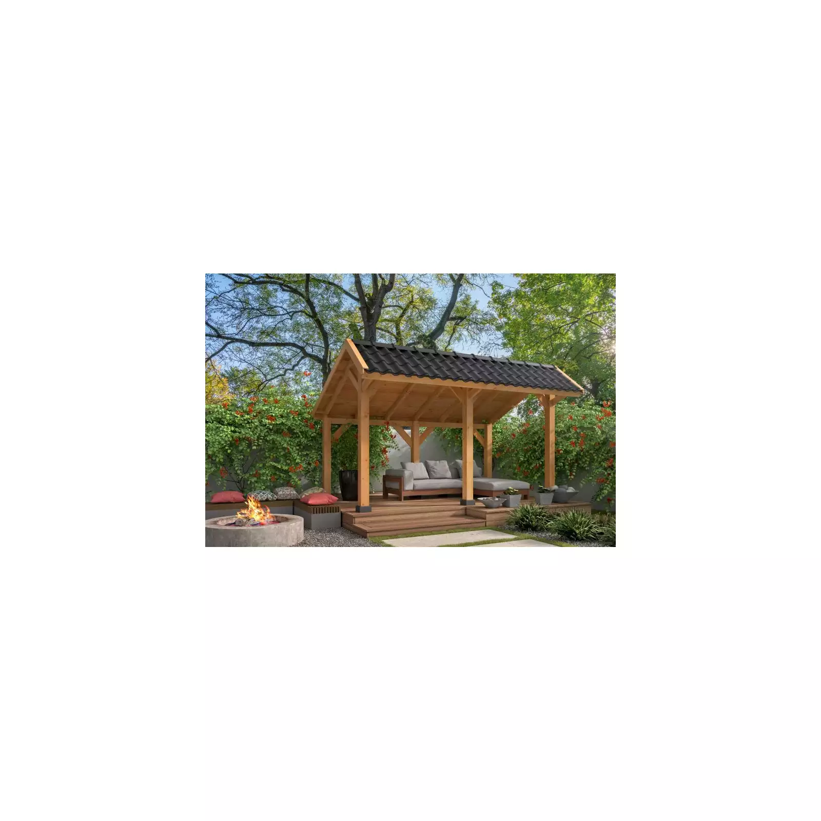 Sus vigas secas y lijadas de 11x11 cm, sin centros de árbol, garantizan una estructura sólida, evitando grietas y mejorando el comportamiento de la madera a lo largo del tiempo. La altura máxima alcanza los 278 cm, lo que le aporta una presencia imponente y ventilación adecuada incluso en los días más calurosos.