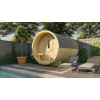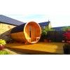 Sauna de madera diseño barril. Esta sauna de madera tiene un moderno diseño de barril de abeto, con diámetro Ø205cm, de largo 350 cm y altura 235 cms.