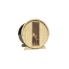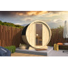 Sauna de madera con diseño de barril de abeto nórdico con Ø205 cms, de largo 160 cms y altura 225 cms.