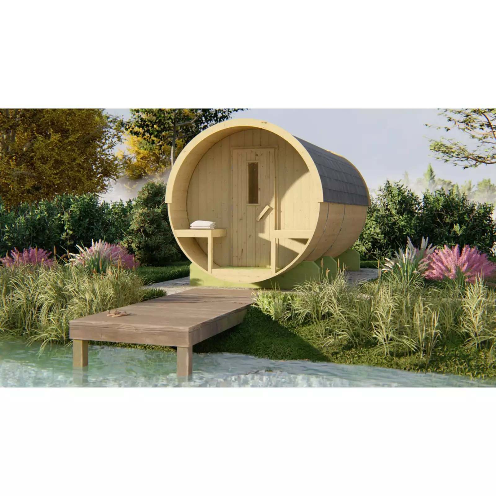 Sauna de madera en forma de barril. Esta sauna de madera tiene un moderno diseño en forma de barril, con diámetro de 205 cms, de largo 400 cms y altura 235 cms.